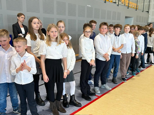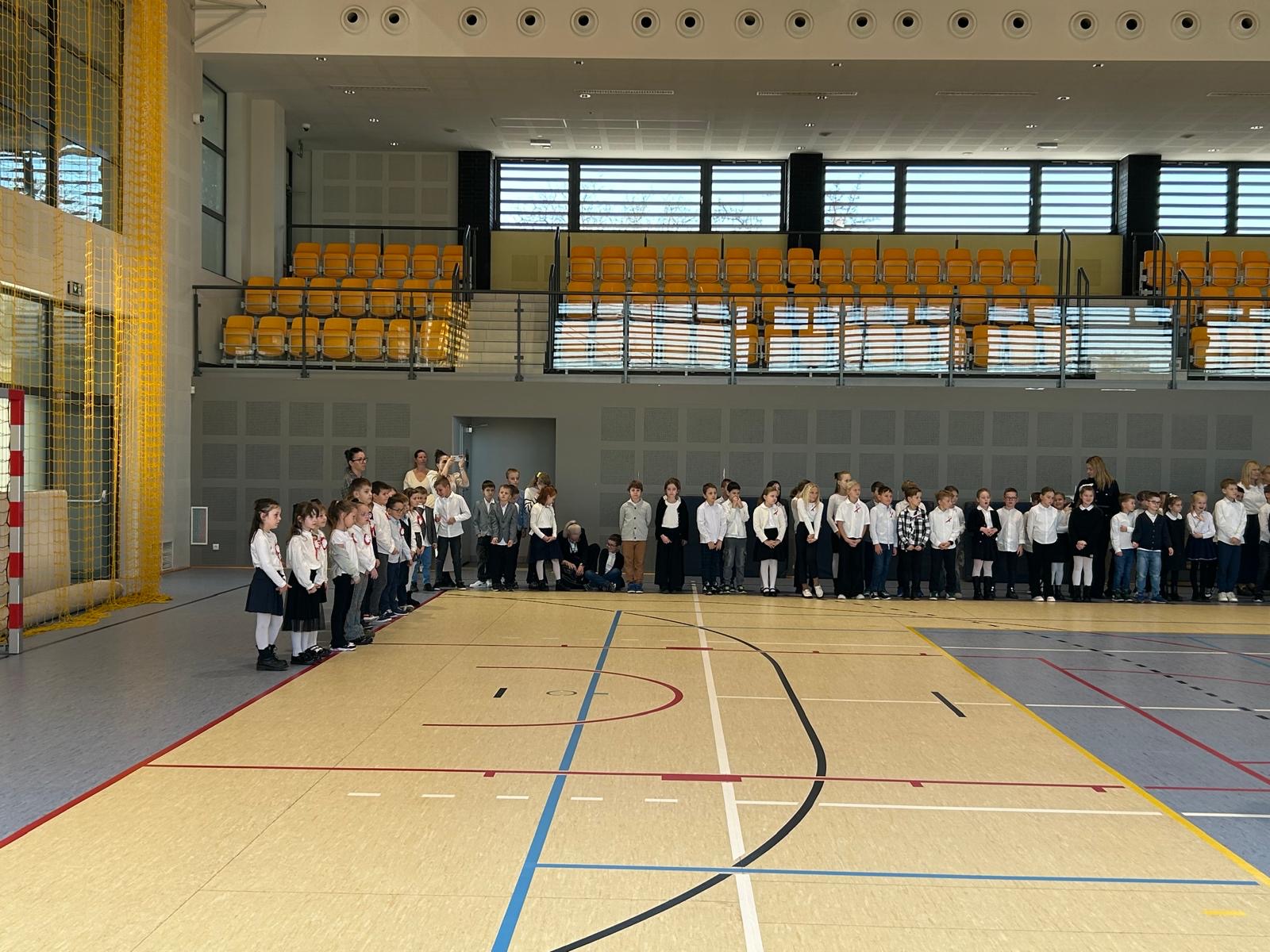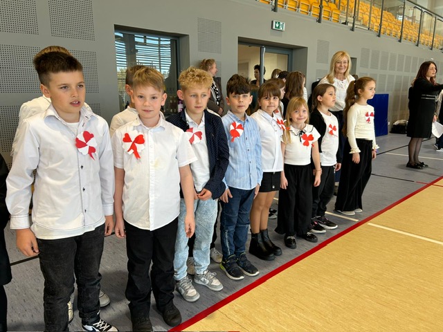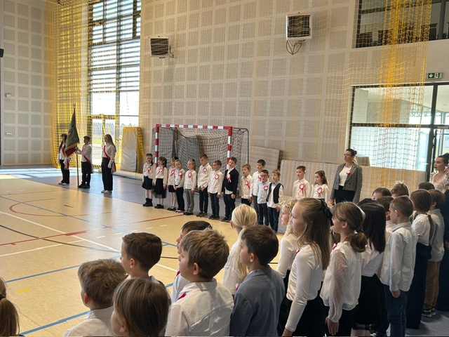 Uroczystość rozpoczęto od odśpiewania hymnu państwowego – „Mazurka Dąbrowskiego”, a następnie wszyscy wspólnie zaśpiewali hymn szkoły - ,,Hej chłopcy, bagnet na broń".