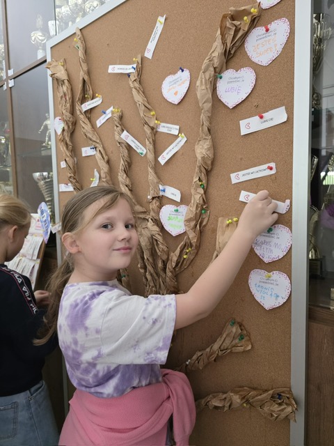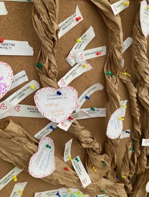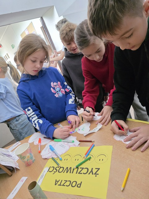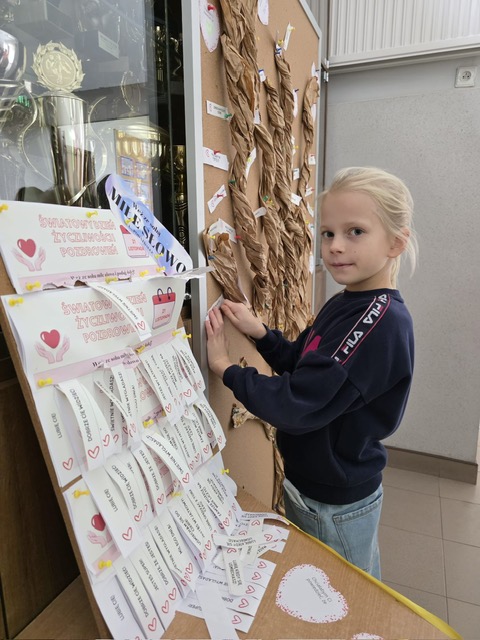 Dzień Życzliwości w naszej szkole był wyjątkowym świętem pełnym ciepła i pozytywnych emocji. W tym roku przygotowaliśmy „Drzewo Dobrych Słów”, na którym uczniowie wieszali liście z miłymi wiadomościami, komplementami i wyrazami wdzięczności. Z dnia na dzień drzewo stawało się coraz bardziej kolorowe, a każdy liść przypominał, jak ważne są małe gesty dobroci. Drugą atrakcją była „Poczta Życzliwości” – specjalna skrzynka, do której można było wrzucać serdeczne wiadomości dla kolegów, koleżanek, nauczycieli i pracowników szkoły. Listy pełne ciepłych słów zostały później dostarczone adresatom, wywołując uśmiechy i radosne reakcje.