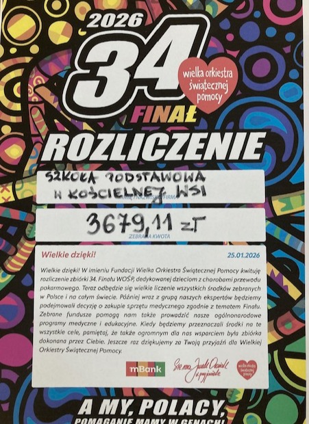 Szkoła Podstawowa w Kościelnej Wsi aktywnie włączyła się w działania związane z 34. Finałem Wielkiej Orkiestry Świątecznej Pomocy. W tegorocznej edycji akcję wsparło 8 wolontariuszy, którzy z ogromnym zaangażowaniem uczestniczyli w zbiórce na rzecz tegorocznego celu WOŚP. Podczas 34. Finału WOŚP, który odbył się 25 stycznia 2026 roku, zbierano środki na diagnostykę i leczenie chorób przewodu pokarmowego u dzieci. Tegoroczna akcja odbywała się pod hasłem „Zdrowe brzuszki naszych dzieci”, a zebrane datki mają pomóc w zakupie nowoczesnego sprzętu medycznego i wspieraniu opieki medycznej najmłodszych pacjentów z problemami gastroenterologicznymi.